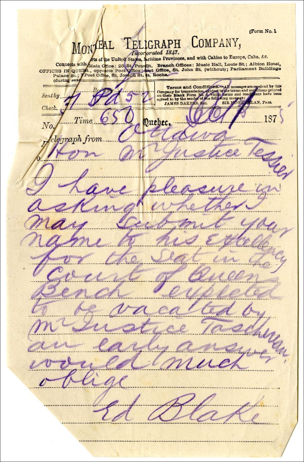 Télégramme d'Edward Black à Ulric-Joseph Tessier à propos de la future nomination de ce dernier à la Cour du Banc de la Reine
