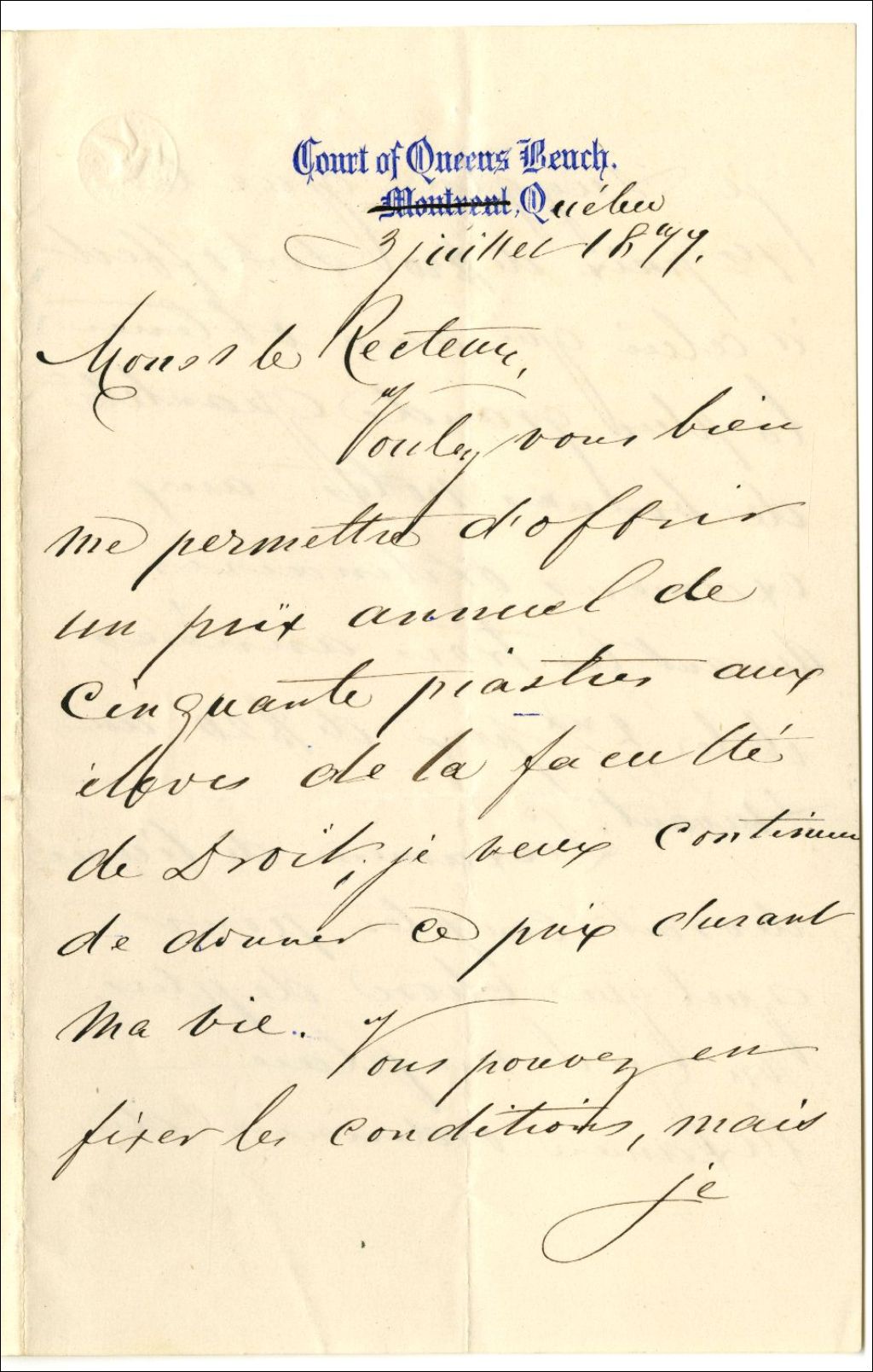 Lettre d'Ulric-Joseph Tessier au Recteur de l'Université Laval, Thomas-Etienne Hamel, prêtre, au sujet de la création d'un prix pour les étudiants de la faculté de droit, 3 juillet 1877, Archives nationales à Rimouski, Fonds Famille Tessier, (01R,P1,S1,SS2,P312).