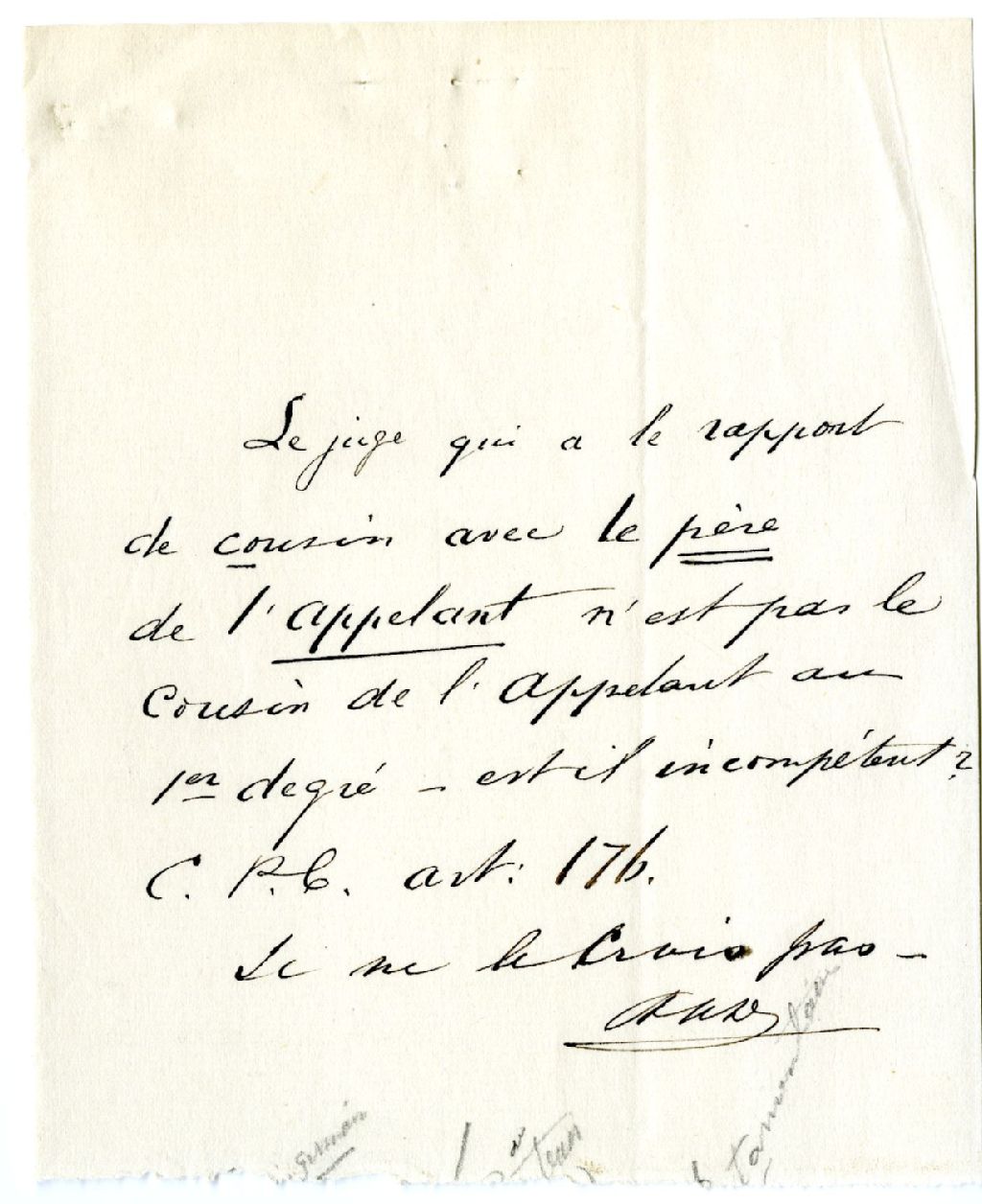 Note provenant de l'Index des causes et factums en appel du juge Tessier, volume 3, [entre 1877 et 1883], Archives nationales à Rimouski, Fonds Famille Tessier, (01R,P1,S1,SS2,P317).