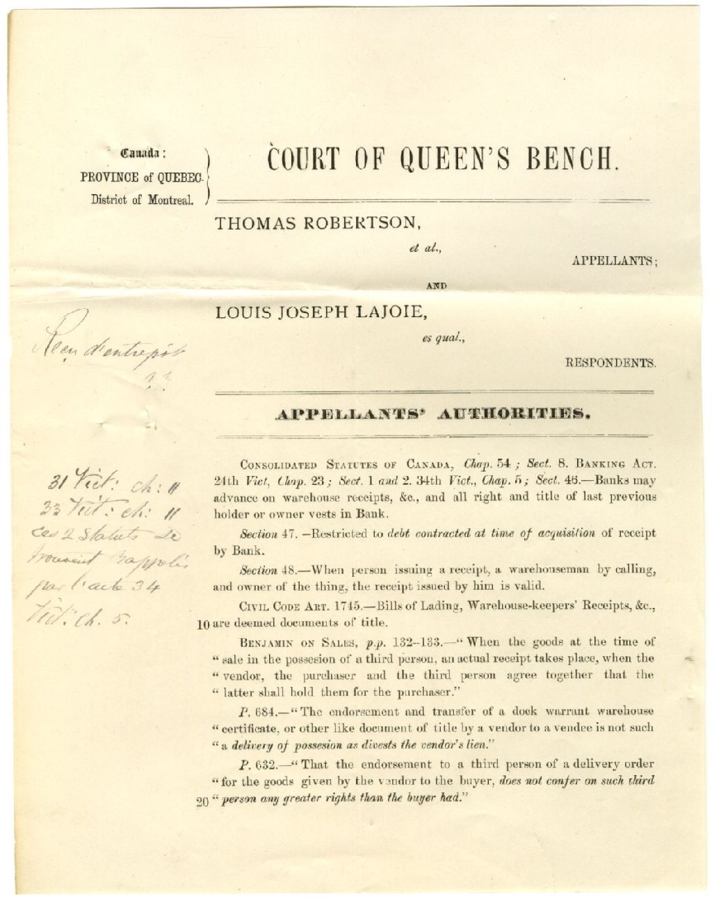 Court of Queen's Bench : Thomas Robertson, appellants and Louis Joseph Lajoie, respondents. Appellant's authorities