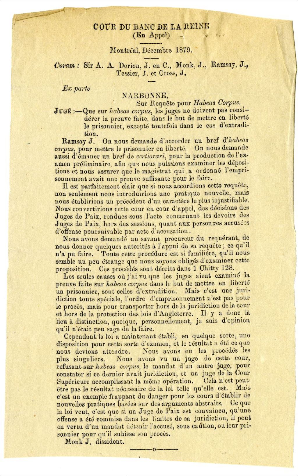 Cour du Banc de la Reine. Ex parte, Narbonne, sur requête pour Habeas Corpus