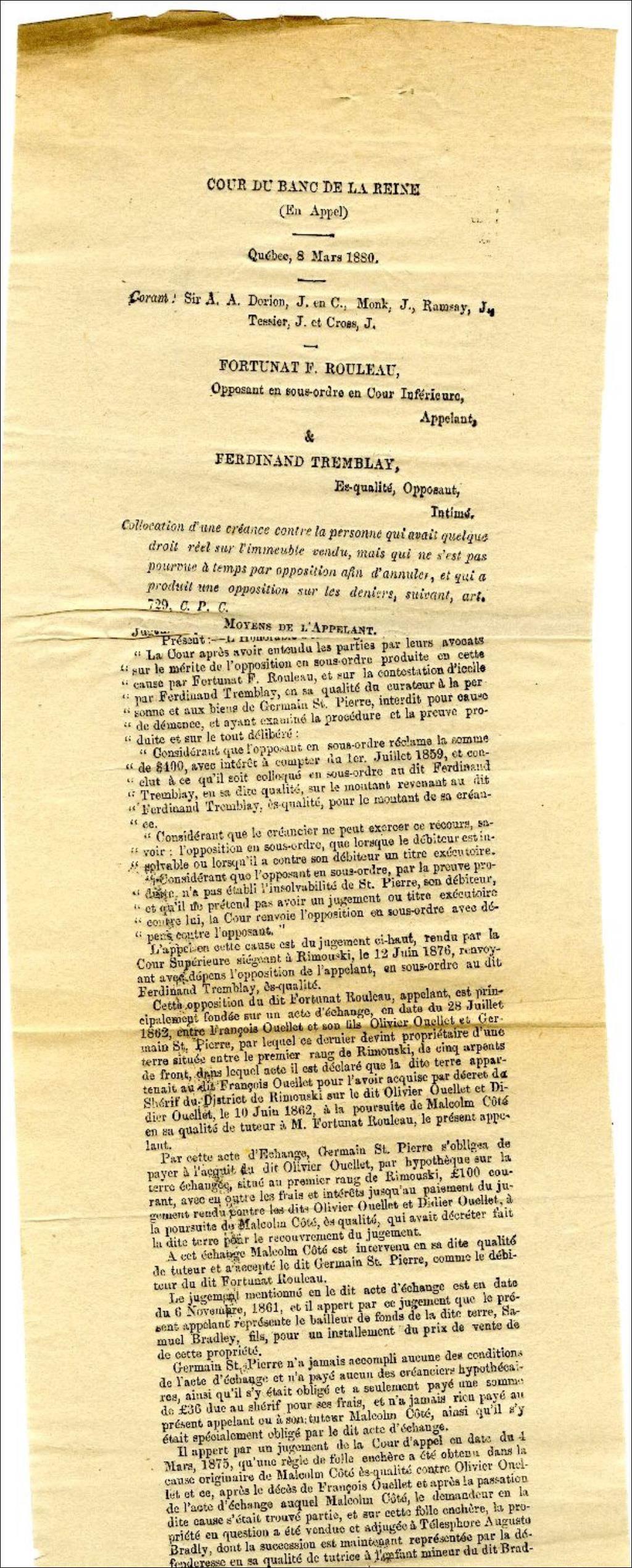 Cour du Banc de la Reine. Fortunat F. Rouleau, appelant & Ferduinand Tremblay, Es-qualité, opposant, Intimé, 8 mars 1880, Archives nationales à Rimouski, Fonds Famille Tessier, (01R,P1,S1,SS2,P344).