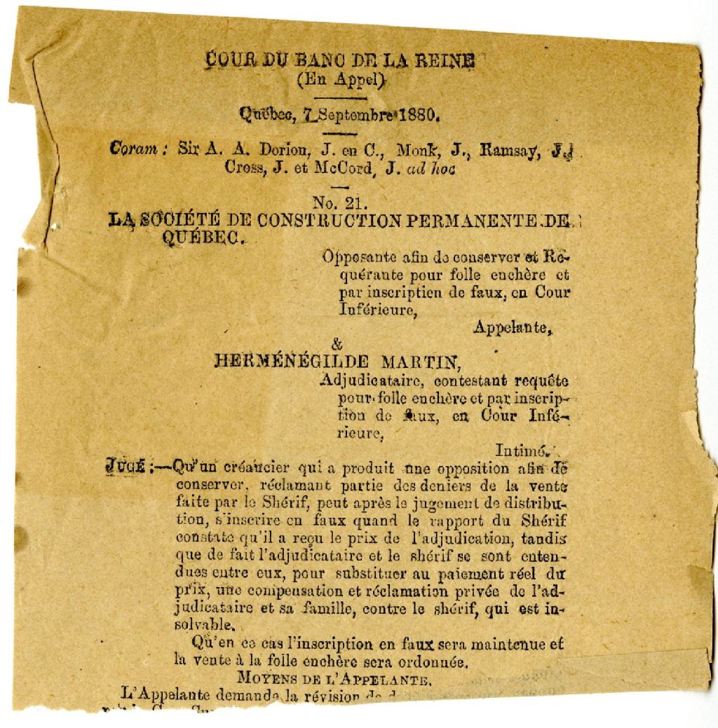 Cour du Banc de la Reine. La Société de construction permanente de Québec, appelante & Herménégilde Martin, intimé, 7 septembre 1880, Archives nationales à Rimouski, Fonds Famille Tessier, (01R,P1,S1,SS2,P345).