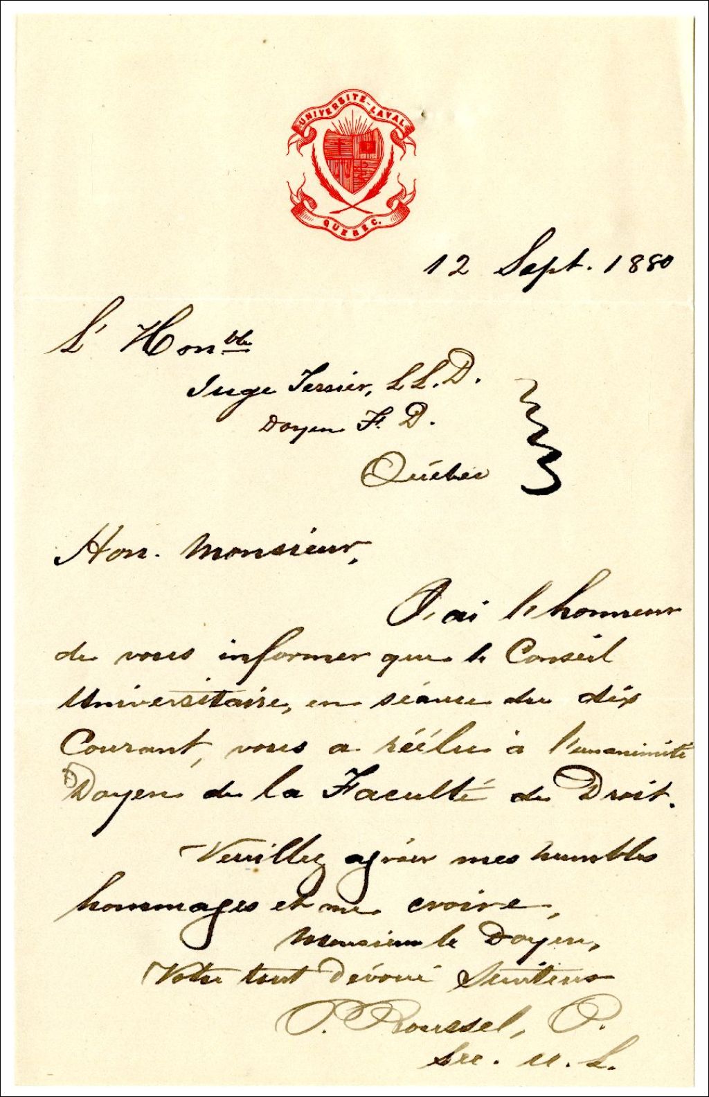 Lettre de P. Roussel à Ulric-Joseph Tessier concernant la réélection de ce dernier comme Doyen de la Faculté de Droit