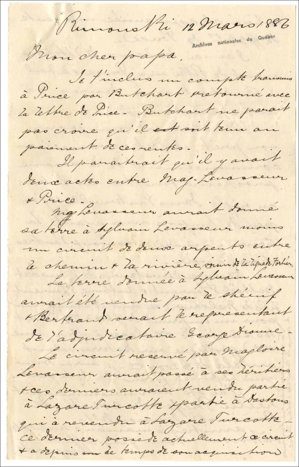 Lettre d'Auguste Tessier à son père portant entre autres sur la rente se rapportant à la permission accordée par Magloire Levasseur à William Price le 19 novembre 1838, 12 mars 1886, Archives nationales à Rimouski, Fonds Famille Tessier, (01R,P1,S1,SS2,P371).