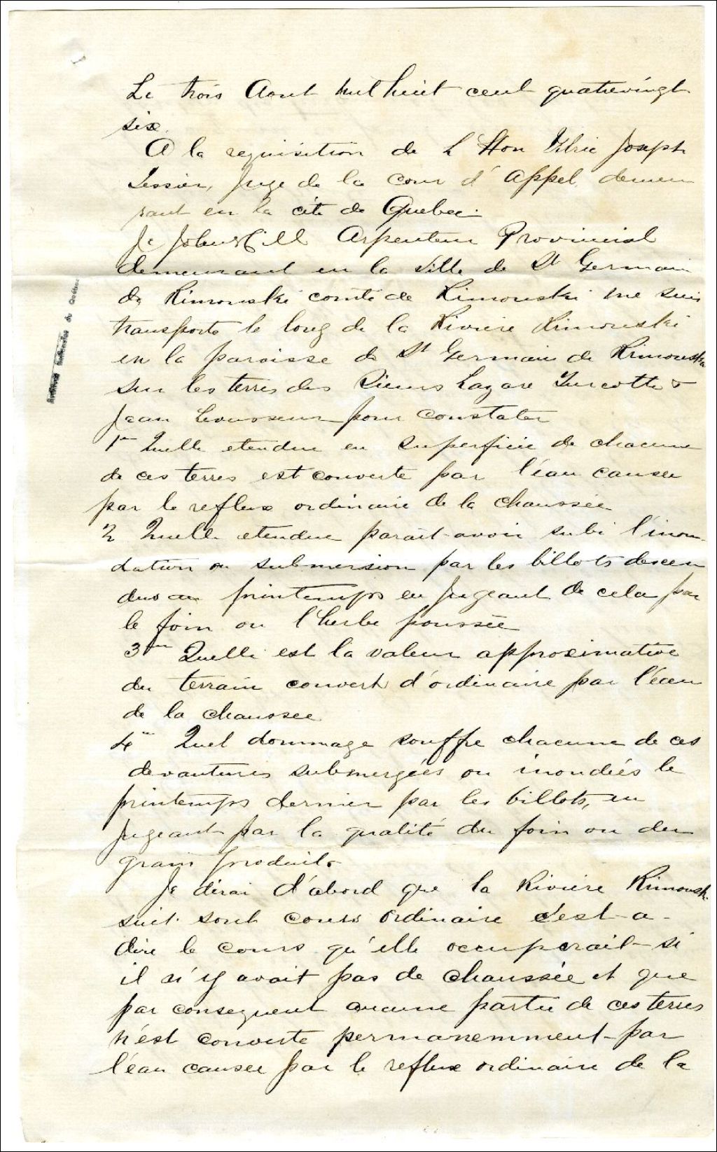 Rapport de l'arpenteur provincial, John Hill sur les dommages aux propriétés de Lazare Turcotte et de Jean Levasseur. Le rapport est accompagné d'une esquisse des terrains situés le long de la Rivière Rimouski, 5 août 1886, Archives nationales à Rimouski, Fonds Famille Tessier, (01R,P1,S1,SS2,P377).