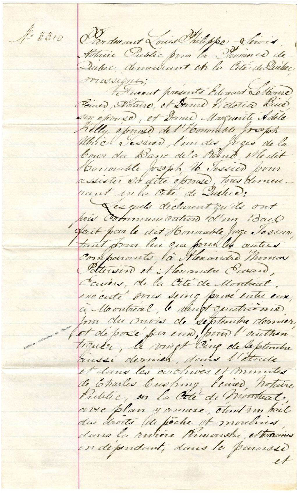 Ratification de bail des droits de pêche et moulins de la Rivière Rimouski par Ulric-Joseph Tessier & autres à Alexandre Thomas Paterson et Alexandre Ewan, 3 novembre 1886, Archives nationales à Rimouski, Fonds Famille Tessier, (01R,P1,S1,SS2,P385).