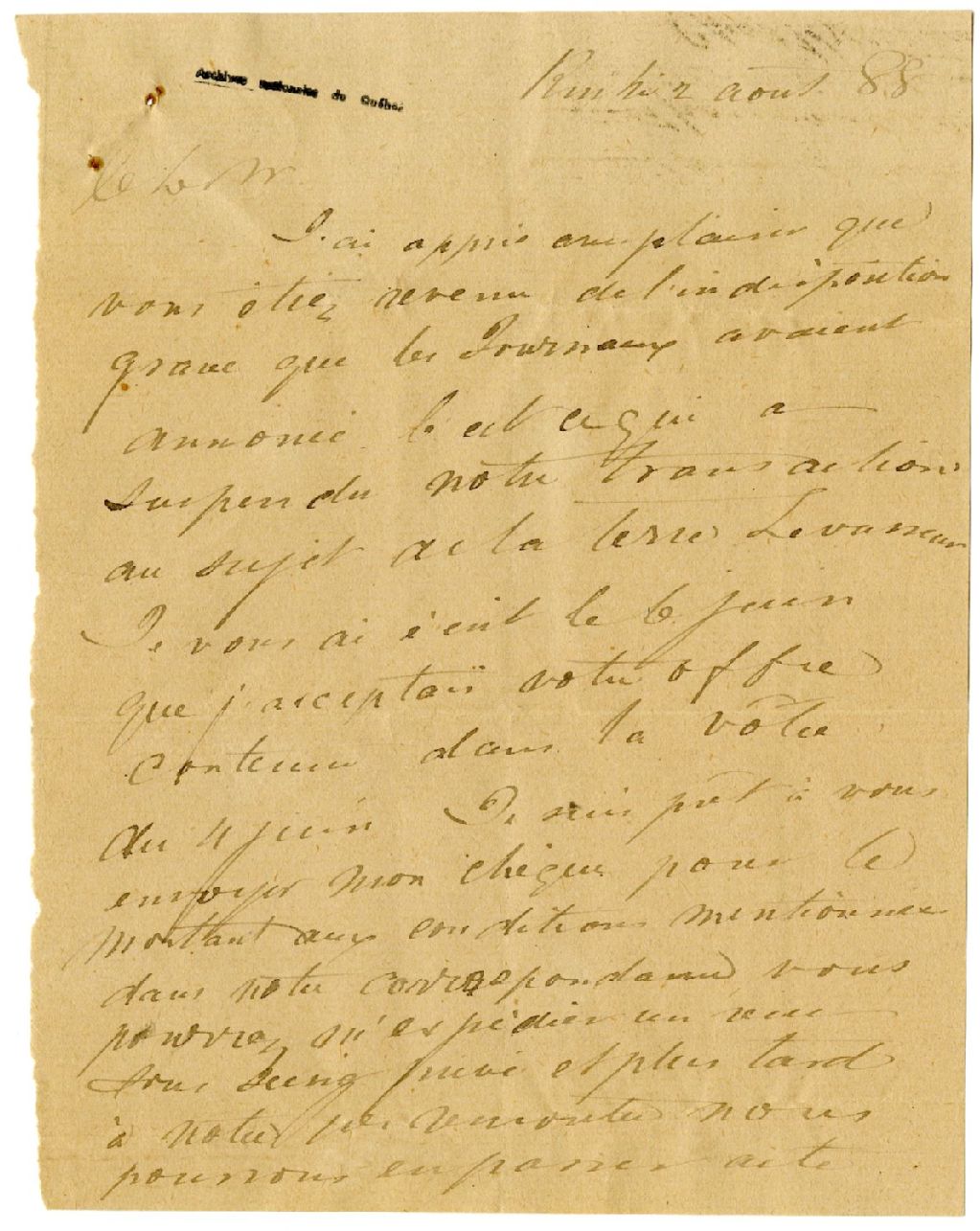 Lettre d'Ulric-Joseph Tessier à Charles Bertrand concernant la terre Levasseur, 2 août 1888, Archives nationales à Rimouski, Fonds Famille Tessier, (01R,P1,S1,SS2,P397).