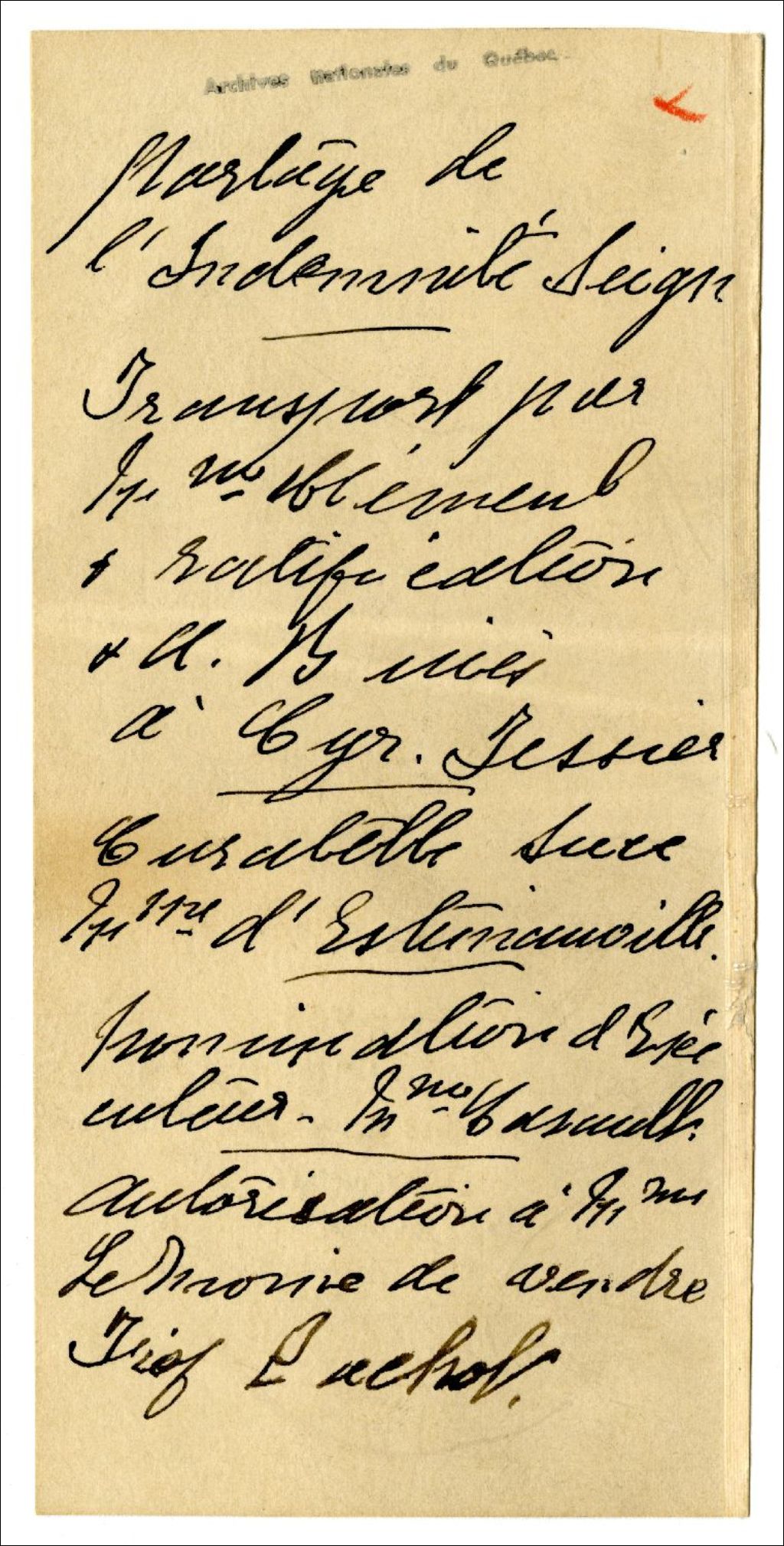 Memo concernant le partage de l'indemnité seigneuriale Drapeau-Tessier, [entre 1829 et 1892], Archives nationales à Rimouski, Fonds Famille Tessier, (01R,P1,S1,SS2,P6).