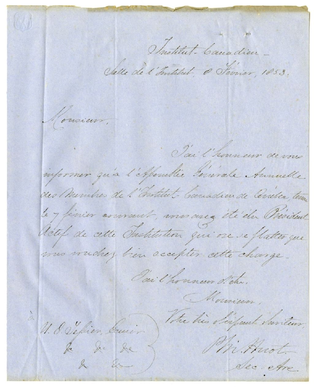 Lettre de P. Huot à Ulric-Joseph Tessier concernant la nomination de ce dernier comme Président actif de l'Institut Canadien de Québec