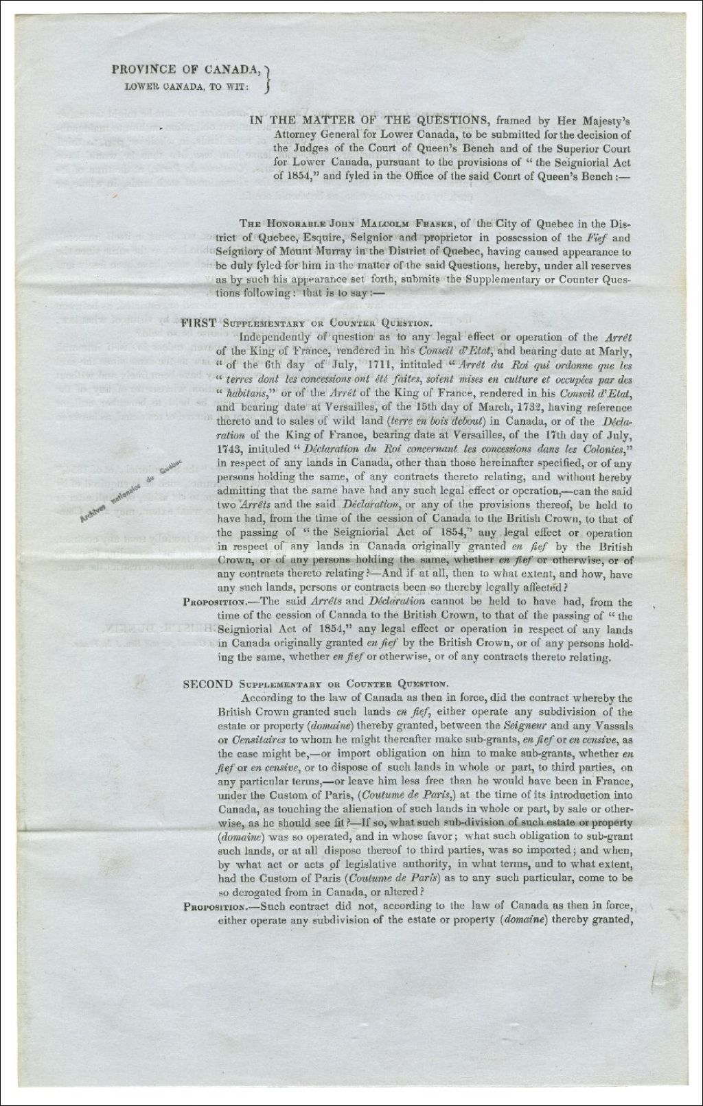 Questions soumises par John Malcom Fraser, Seigneur de Mount Murray, se rapportant à «l'Acte seigneuriale de 1854», 7 mai 1855, Archives nationales à Rimouski, Fonds Famille Tessier, (01R,P1,S1,SS2,P86).