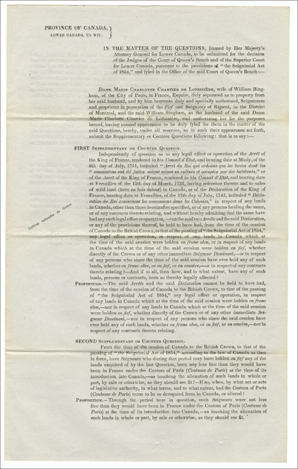Questions soumises par Marie Charlotte Chartier de Lotbinière, Seigneuresse de Rigaud, se rapportant à «l'Acte seigneuriale de 1854», 7 mai 1855, Archives nationales à Rimouski, Fonds Famille Tessier, (01R,P1,S1,SS2,P87).