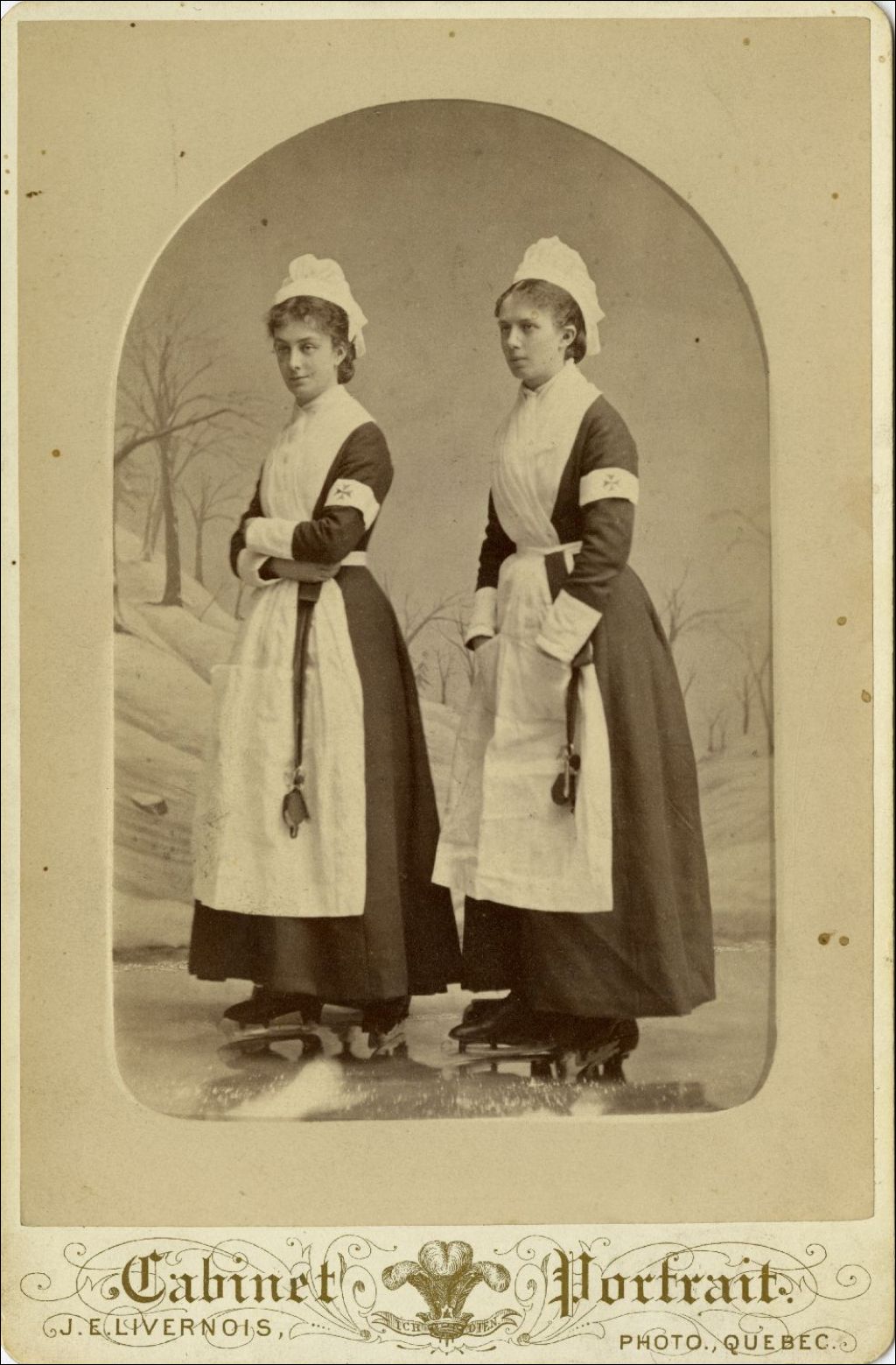 Emma et Adèle Tessier en uniforme de la Croix-Rouge en patins