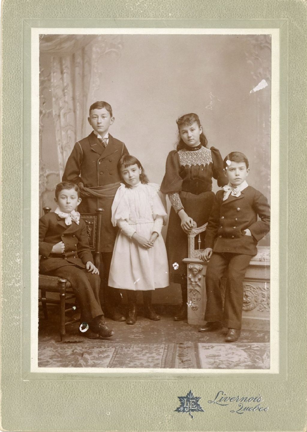 Georges, Jules, Adèle, Emma, Auguste Tessier, [vers 1870], Archives nationales à Rimouski, Fonds Famille Tessier, (01R,P1,S200,P125), J.E. Livernois, Photo. Québec.
