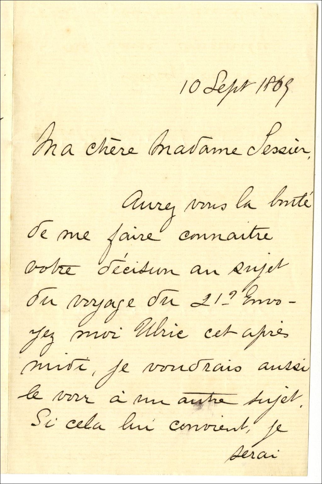 Lettre d'Alexandre Chauveau à Marguerite-Adèle Kelly-Tessier, 10 septembre 1869, Archives nationales à Rimouski, Fonds Famille Tessier, (01R,P1,S2,P24).