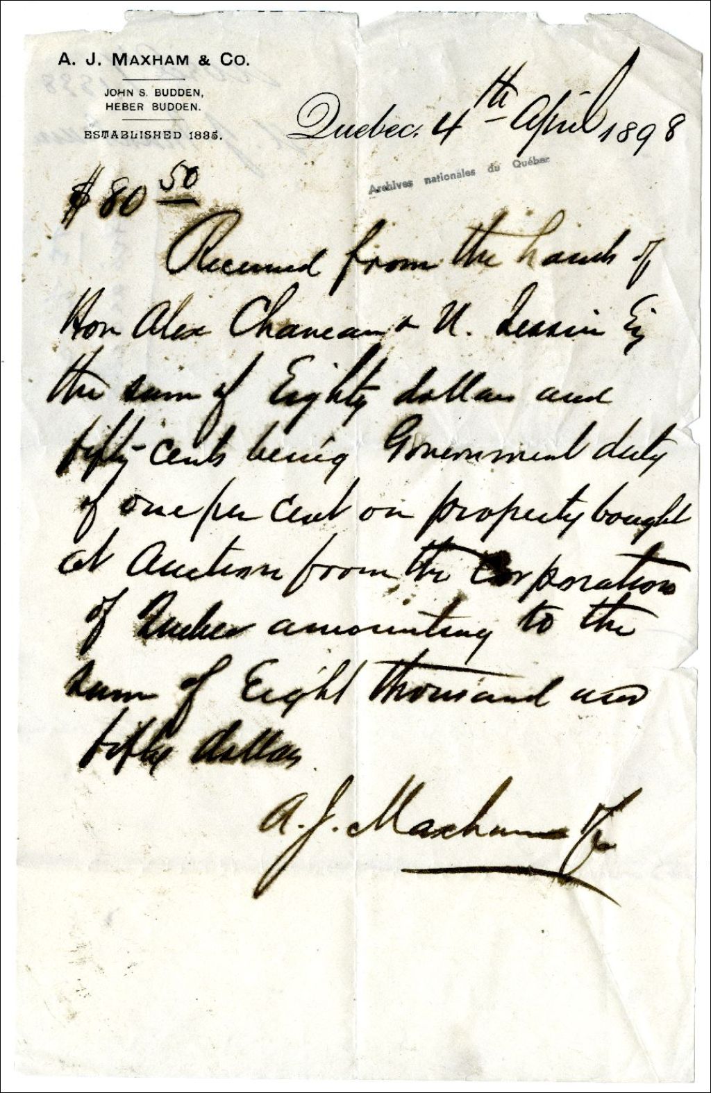 Reçu octroyé par A. J. Maxham & Co. à Alexandre Chauveau et Ulric Tessier, 4 avril 1898, Archives nationales à Rimouski, Fonds Famille Tessier, (01R,P1,S3,SS2,P139).