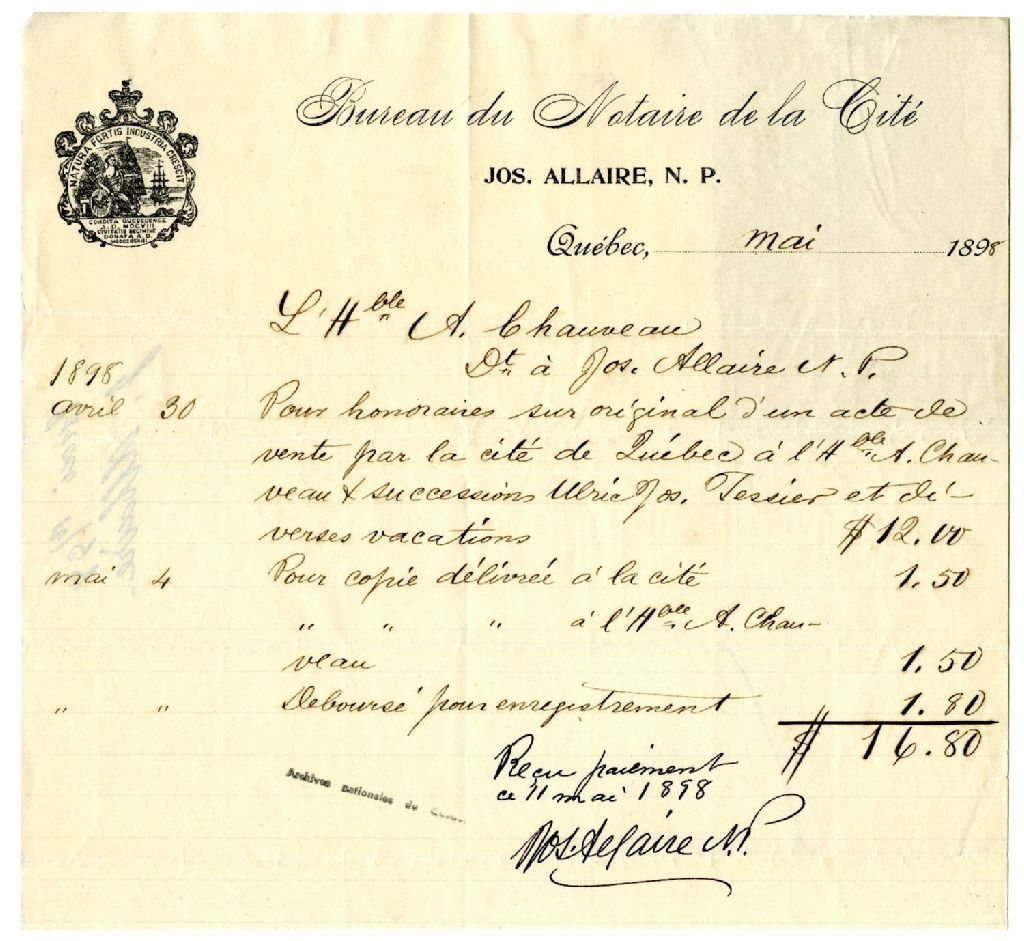 Facture du notaire Joseph Allaire à Alexandre Chauveau, mai 1898, Archives nationales à Rimouski, Fonds Famille Tessier, (01R,P1,S3,SS2,P140).