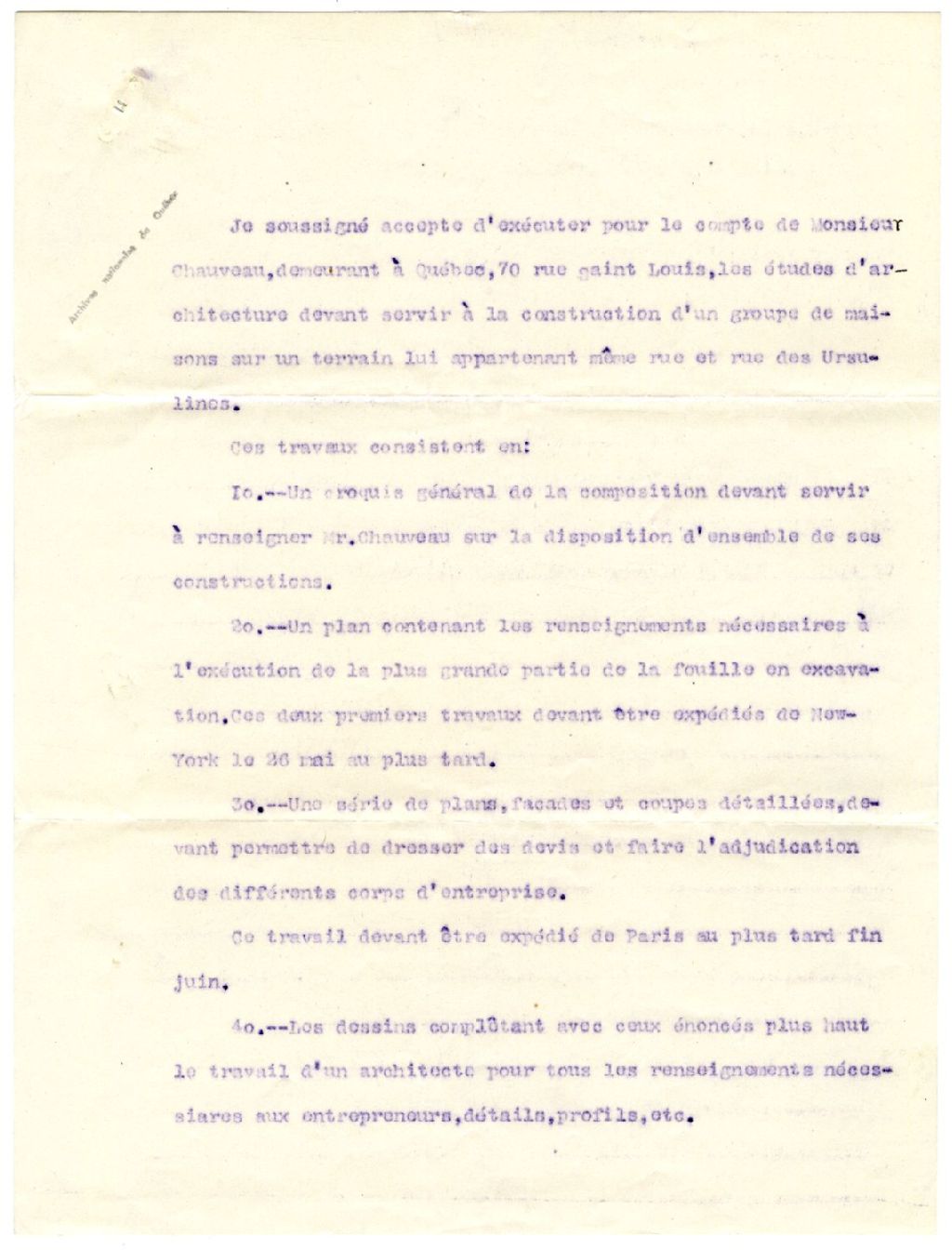 Convention concernant les études d'architecture devant servir à la construction d'un groupe de maison au coin de la rue Saint-Louis et de la rue des Ursulines pour le compte d'Alexandre Chauveau