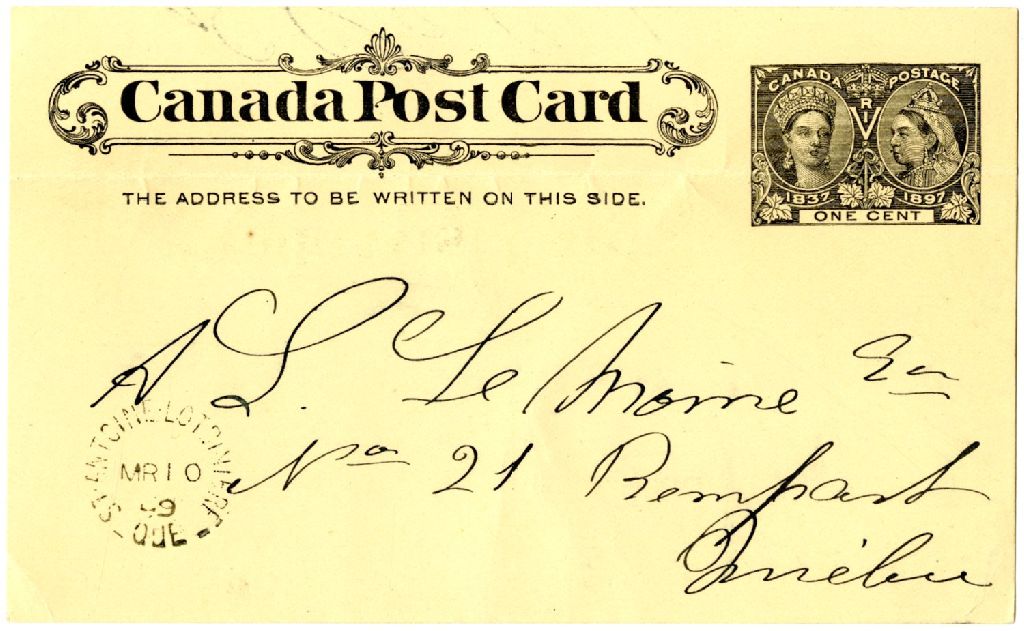 Carte postale de Ad. Blanchet, prêtre, à A. L. LeMoine, 9 mars 1899, Archives nationales à Rimouski, Fonds Famille Tessier, (01R,P1,S3,SS2,P148).