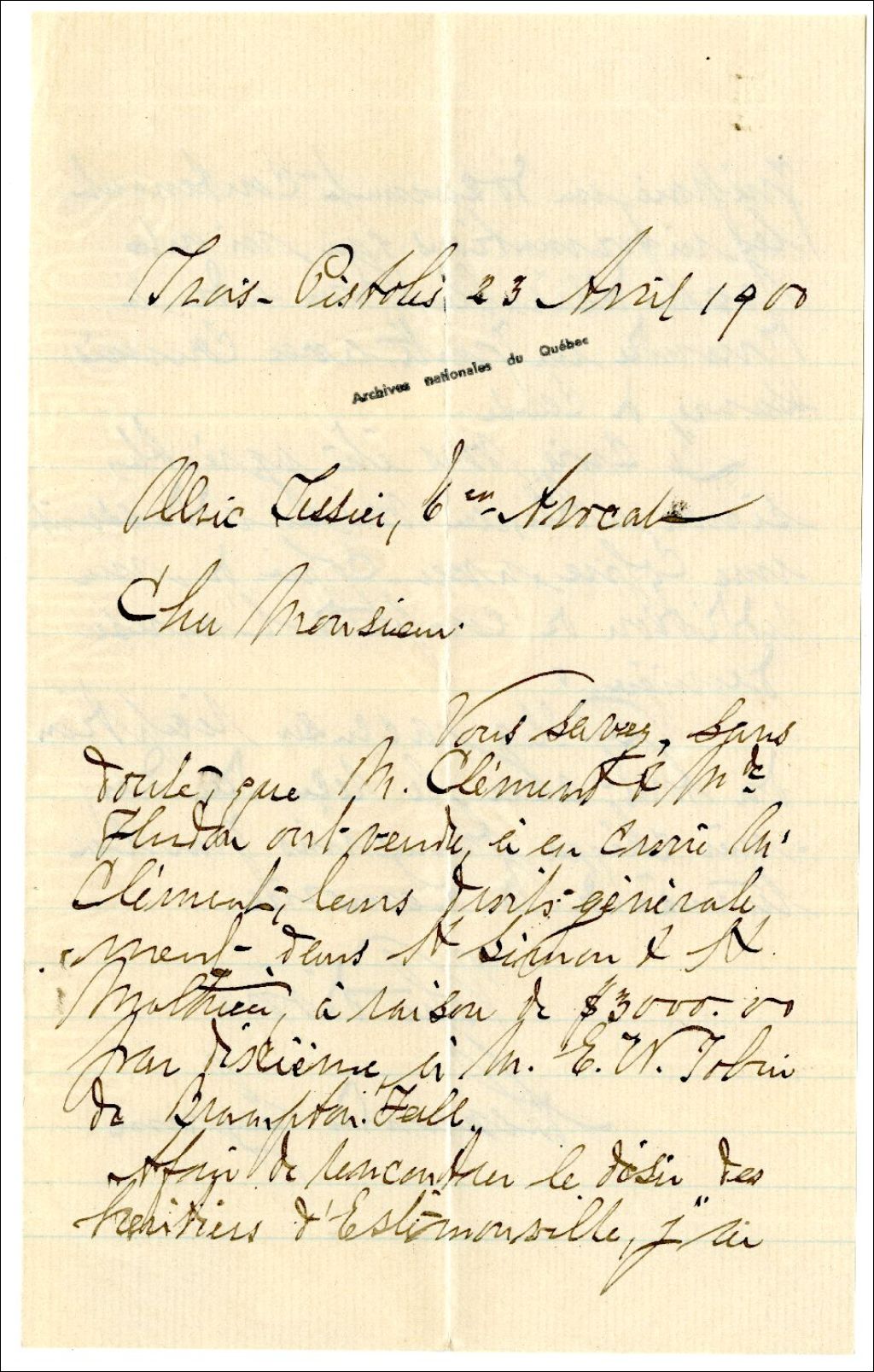 Lettre d'Alexandre Gagnon à Ulric Tessier concernant la vente d'une partie de la seigneurie Nicolas Rioux par les héritiers de Joséphine d'Estimauville, 23 avril 1900, Archives nationales à Rimouski, Fonds Famille Tessier, (01R,P1,S3,SS2,P173).