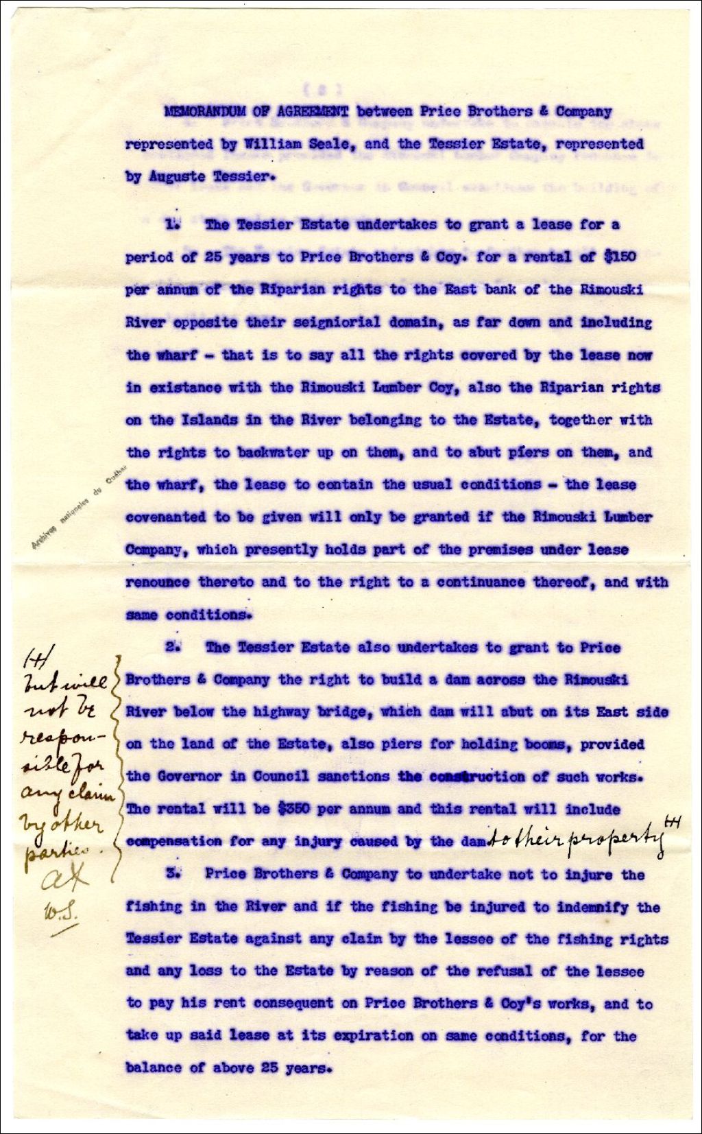 Promesse de bail entre la succession Tessier et Price Brothers & Company