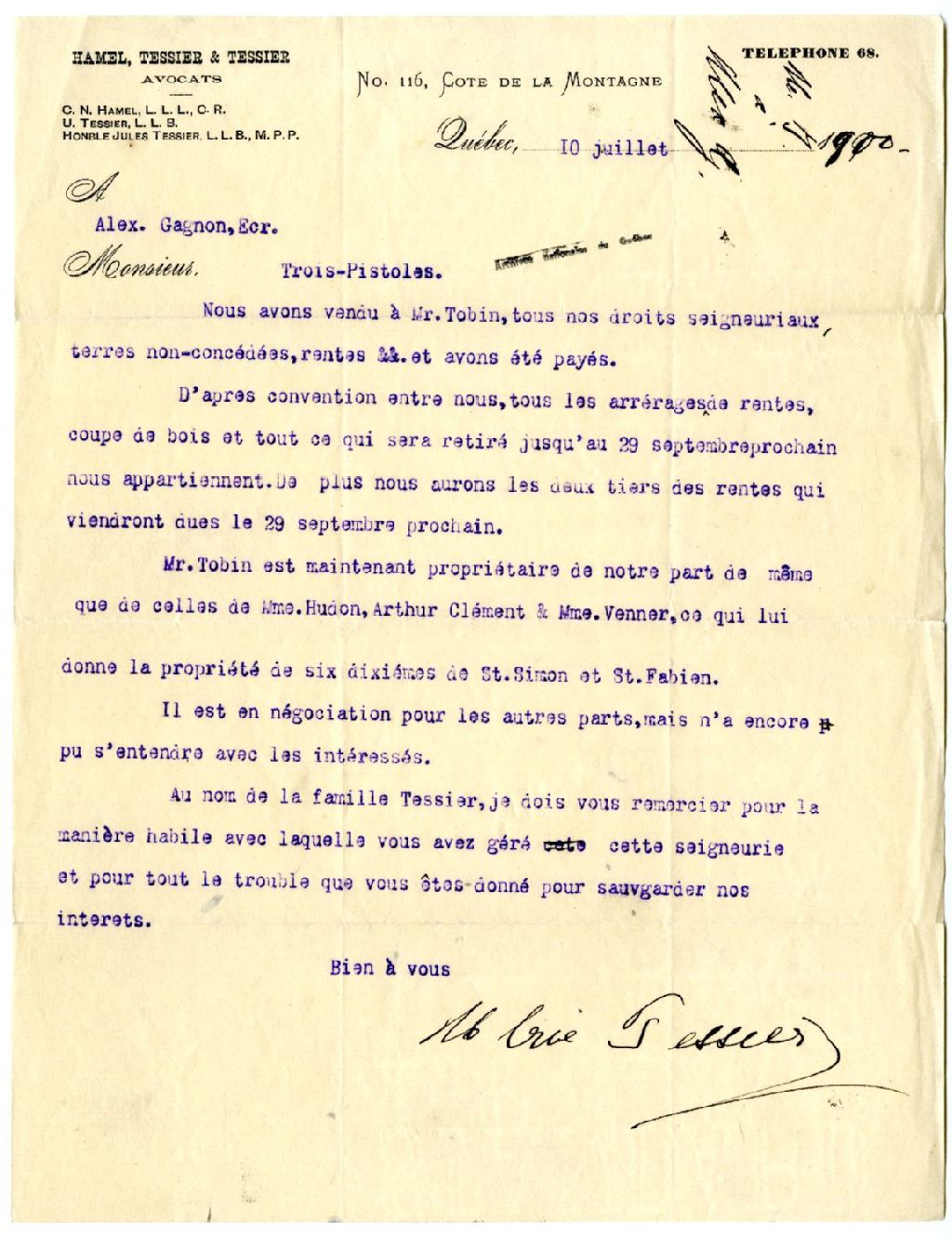 Lettre d'Ulric Tessier à Alexandre Gagnon concernant la vente des droits seigneuriaux d'une partie de Saint-Simon et de Saint-Fabien à Edmund William Tobin, 10 juillet 1900, Archives nationales à Rimouski, Fonds Famille Tessier, (01R,P1,S3,SS2,P183).