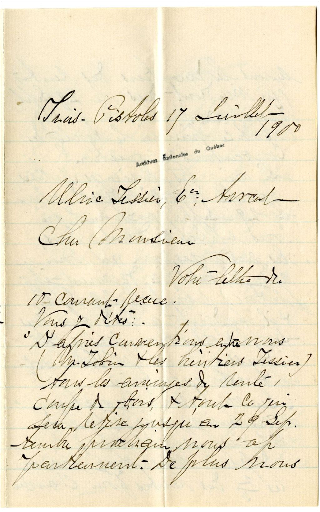 Lettre d'Alexandre Gagnon à Ulric Tessier concernant les coupes de bois de la seigneurie Nicolas Rioux, 17 juillet 1900, Archives nationales à Rimouski, Fonds Famille Tessier, (01R,P1,S3,SS2,P184).