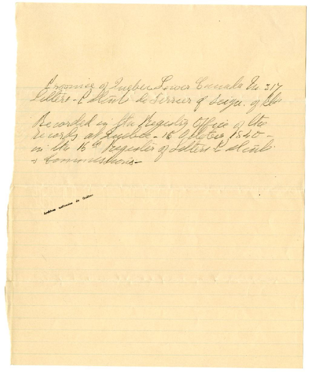 Note concernant les lettres patentes de la Seigneurie de Rimouski, août 1900, Archives nationales à Rimouski, Fonds Famille Tessier, (01R,P1,S3,SS2,P186).