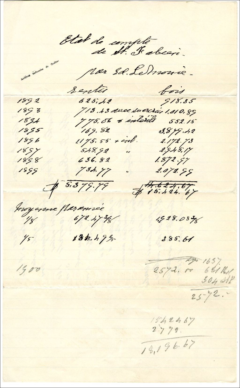 État des rentes et bois de Saint-Fabien de 1892 à 1899 par Edouard LeMoine, 3 août 1900, Archives nationales à Rimouski, Fonds Famille Tessier, (01R,P1,S3,SS2,P187).