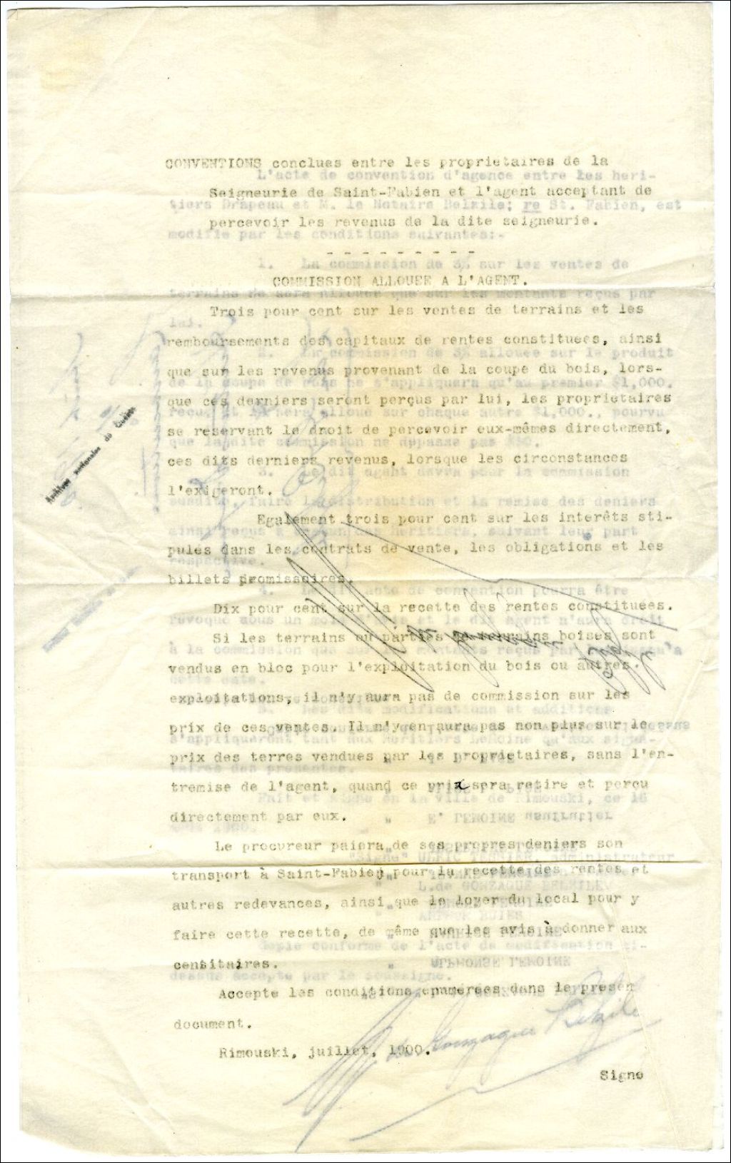 Convention conclue entre les propriétaires de la Seigneurie de Saint-Fabien et Louis de Gonzague Belzile, 16 août 1900, Archives nationales à Rimouski, Fonds Famille Tessier, (01R,P1,S3,SS2,P188).