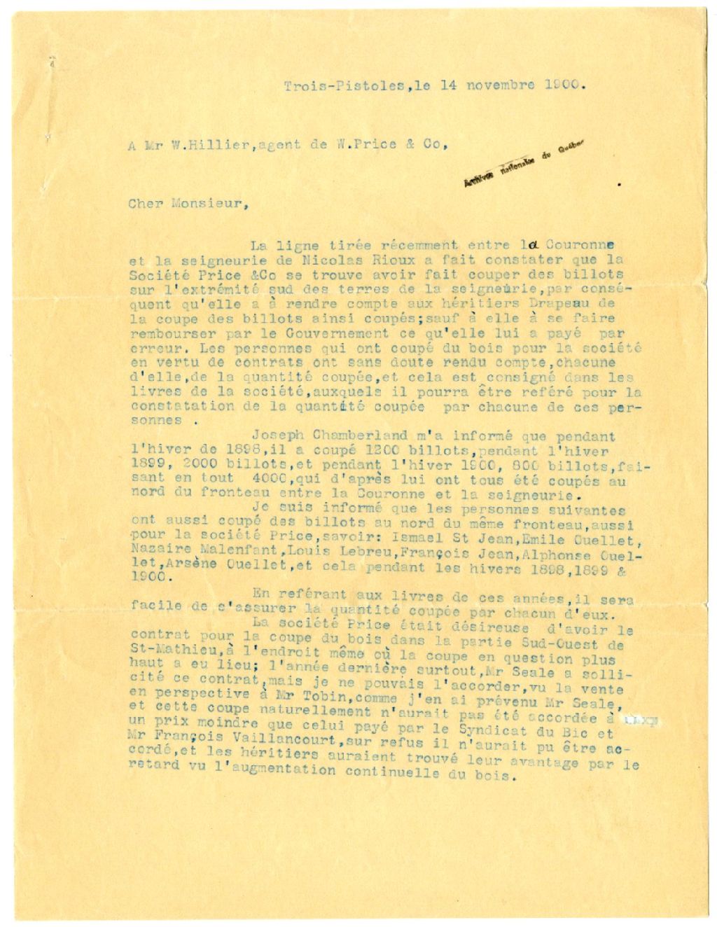 Projet de lettre d'Alexandre Gagnon à W. Hillier de W. Price & Co. concernant la coupe de bois au sud de la seigneurie Nicolas Rioux, 14 novembre 1900, Archives nationales à Rimouski, Fonds Famille Tessier, (01R,P1,S3,SS2,P196).