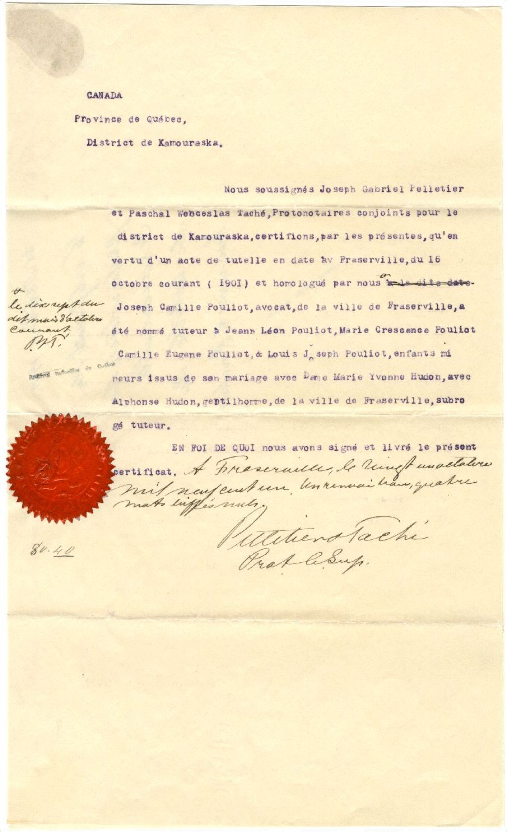 Acte de tutelle nommant Joseph Pouliot tuteur de Jean Léon Pouliot et Marie Crescence Pouliot enfants mineurs de Marie-Yvonne Hudon et Alphonse Hudon, 21 octobre 1901, Archives nationales à Rimouski, Fonds Famille Tessier, (01R,P1,S3,SS2,P222).