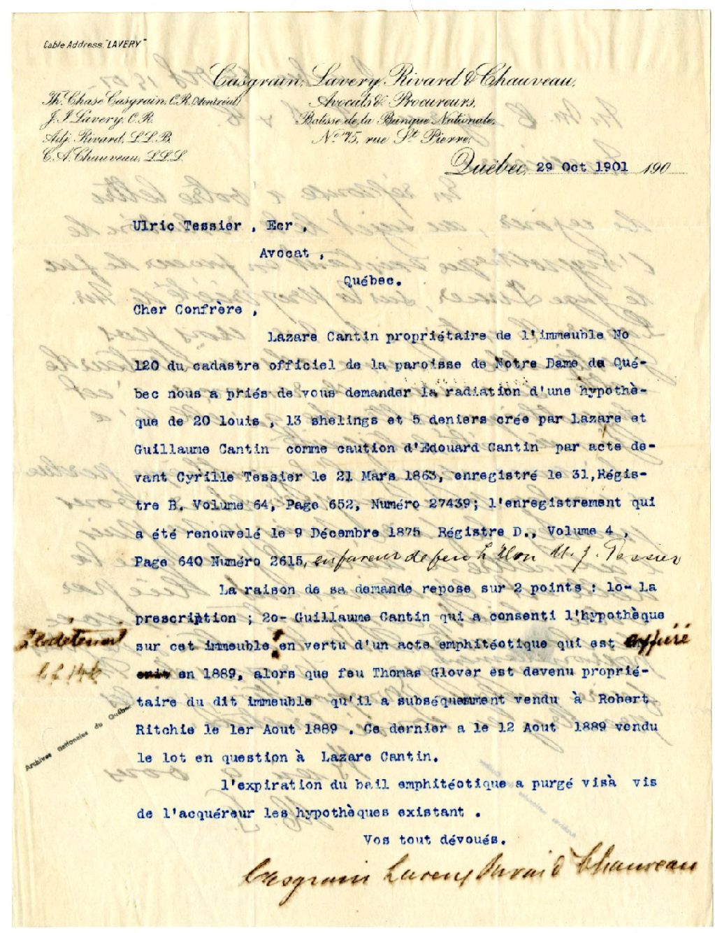 Lettre de la firme d'avocats et procureurs Casgrain, Lavery, Rivard & Chauveau à Ulric Tessier concernant la radiation d'une hypothèque, accompagnée de la réponse de ce dernier, 29 octobre 1901, Archives nationales à Rimouski, Fonds Famille Tessier, (01R,P1,S3,SS2,P224).