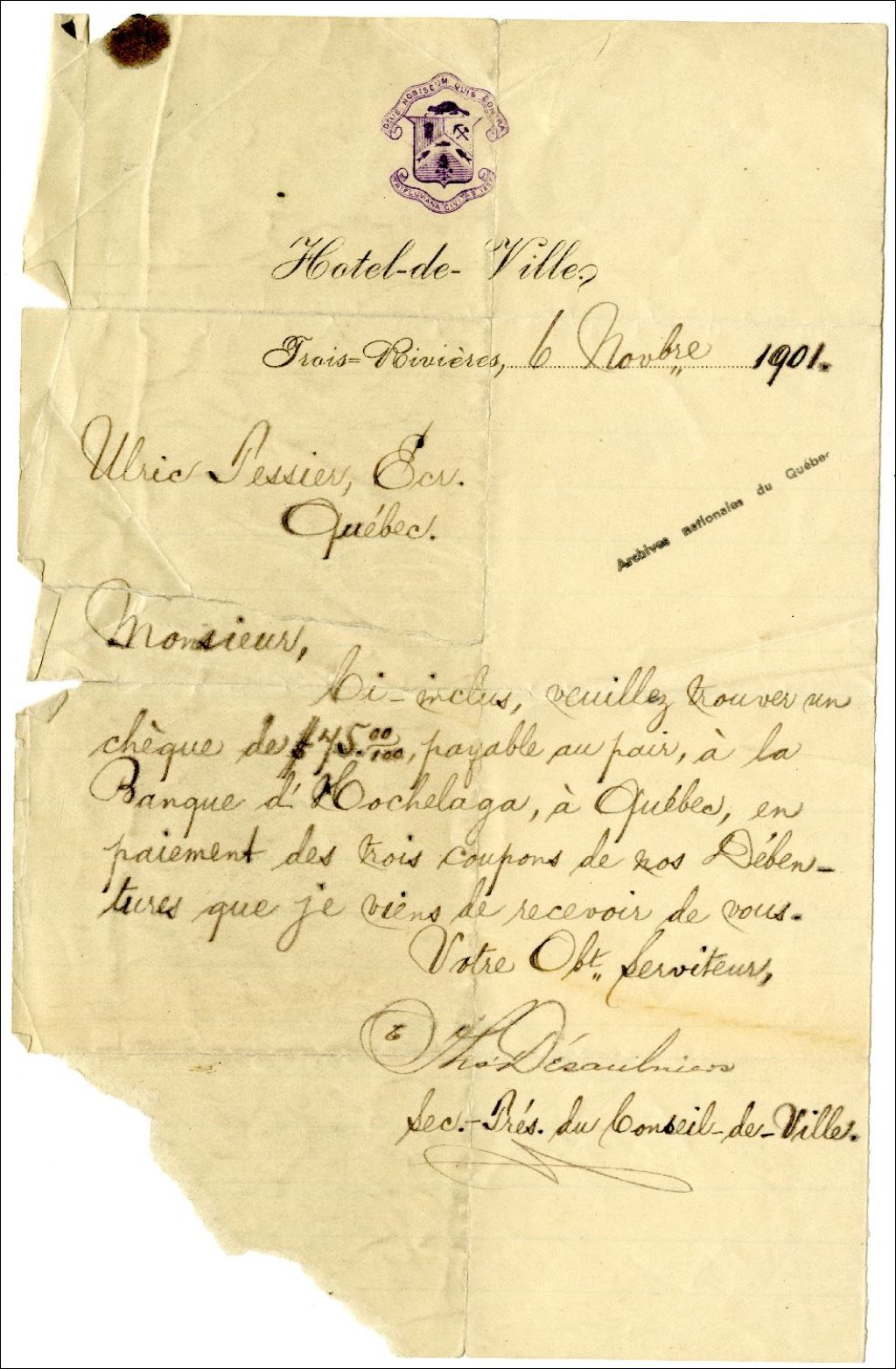 Lettre du secrétaire-trésorier du Conseil de ville de Trois-Rivières à Ulric Tessier concernant le paiement de coupons de débentures, 6 novembre 1901, Archives nationales à Rimouski, Fonds Famille Tessier, (01R,P1,S3,SS2,P226).