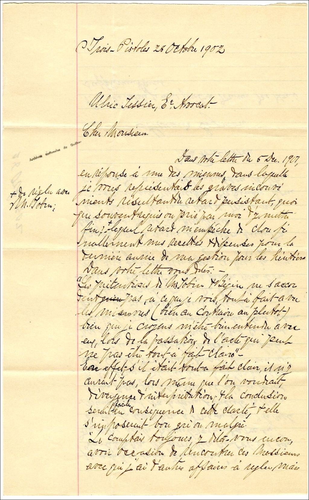 Lettre d'Alexandre Gagnon à Ulric Tessier, 28 octobre 1902, Archives nationales à Rimouski, Fonds Famille Tessier, (01R,P1,S3,SS2,P238).