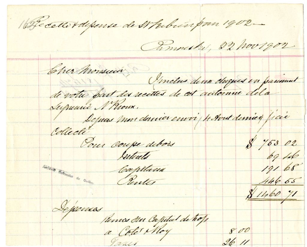 Recettes et dépenses de Saint-Fabien pour l'année 1902, 22 novembre 1902, Archives nationales à Rimouski, Fonds Famille Tessier, (01R,P1,S3,SS2,P242).