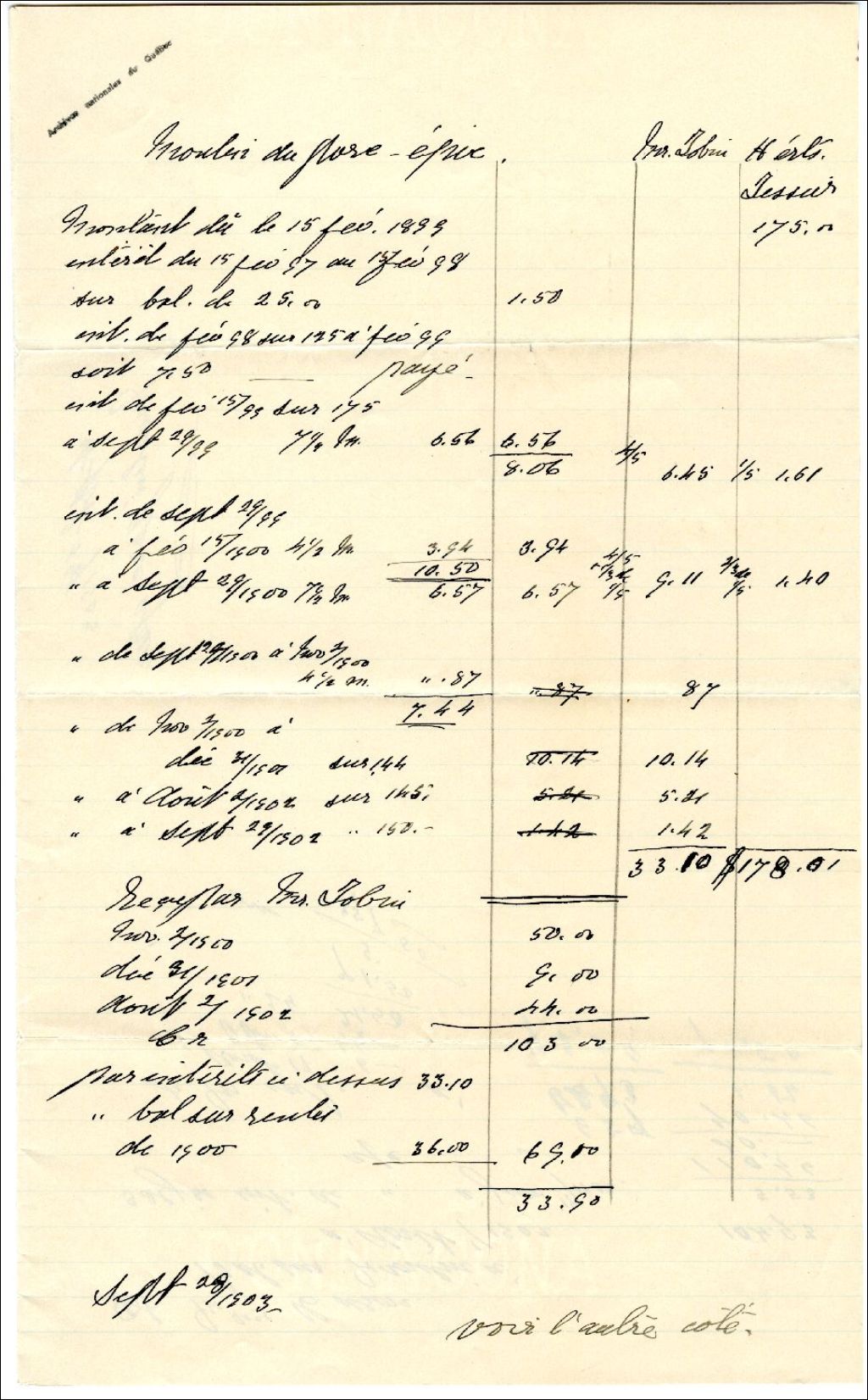 État de compte du moulin Porc-Épic, 28 septembre 1903, Archives nationales à Rimouski, Fonds Famille Tessier, (01R,P1,S3,SS2,P269).