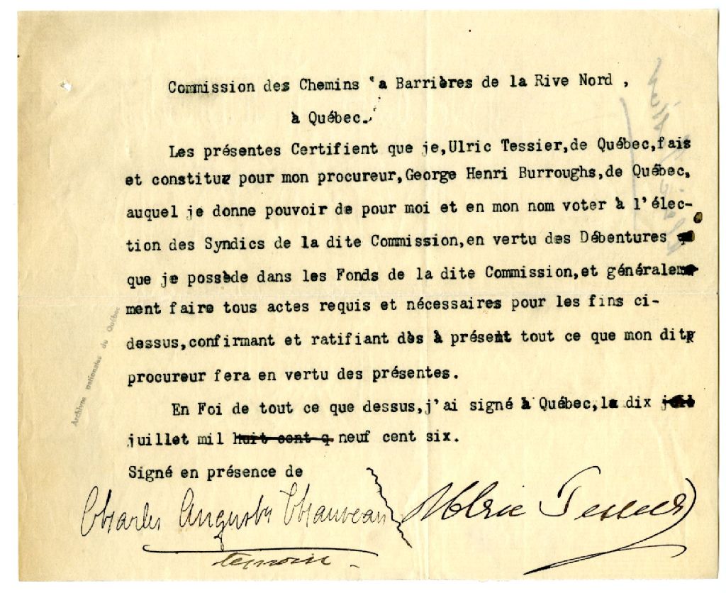 Procuration d'Ulric Tessier à la Commission des chemins à barrières de la Rive Nord nommant Georges Henri Burroughs pour le représenter, 10 juillet 1906, Archives nationales à Rimouski, Fonds Famille Tessier, (01R,P1,S3,SS2,P282).