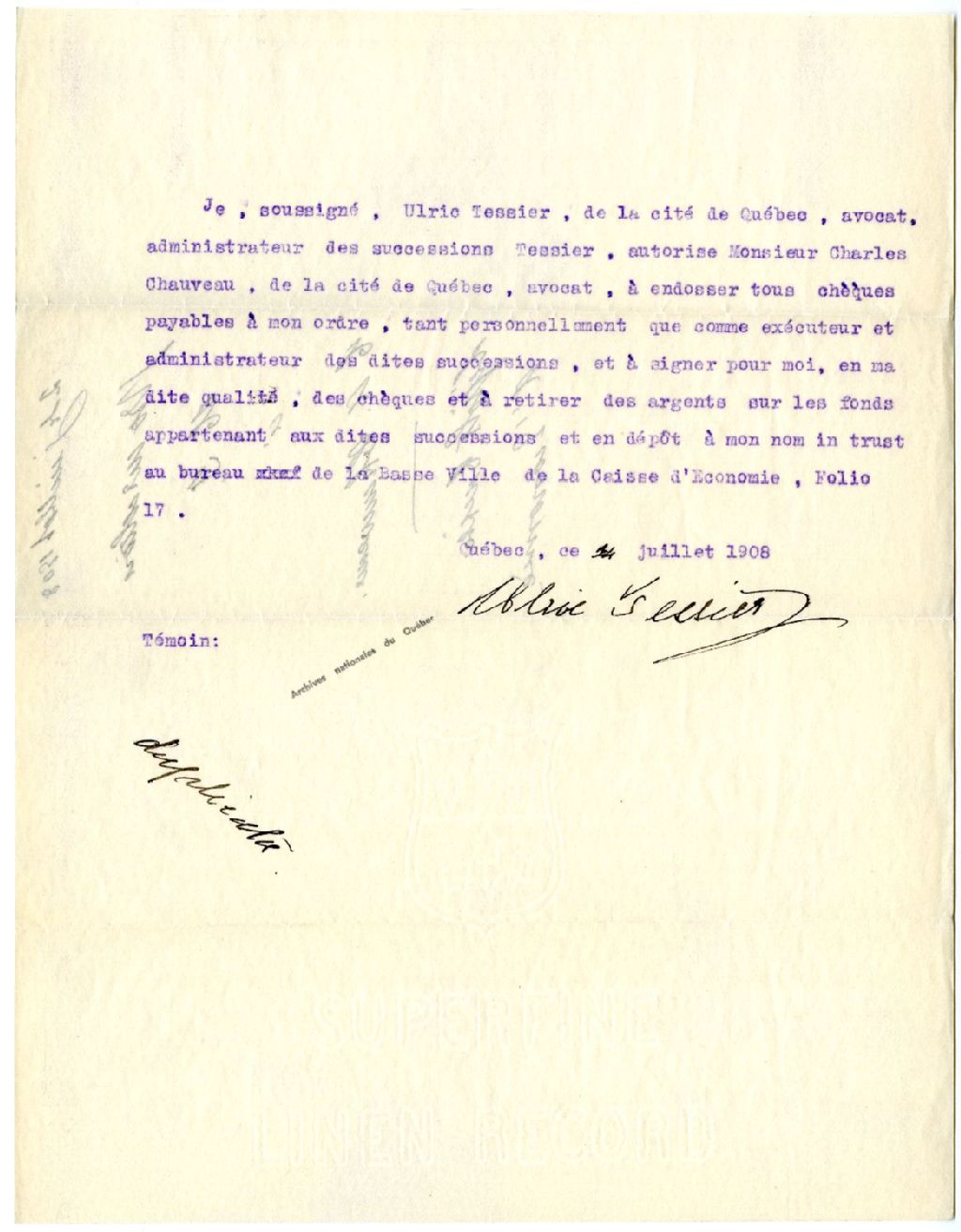 Procuration d'Ulric Tessier à Charles-Alexandre Chauveau pour la signature de chèque et autres opérations bancaires à la Caisse d'économie de la Basse-ville