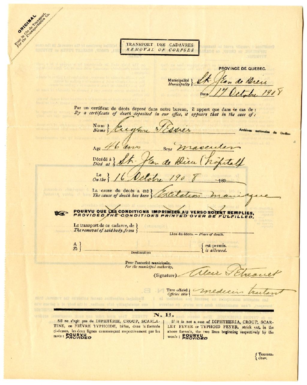 Formulaire de transport des cadavres se rapportant au décès d'Eugène Tessier, 17 octobre 1908, Archives nationales à Rimouski, Fonds Famille Tessier, (01R,P1,S3,SS2,P293).