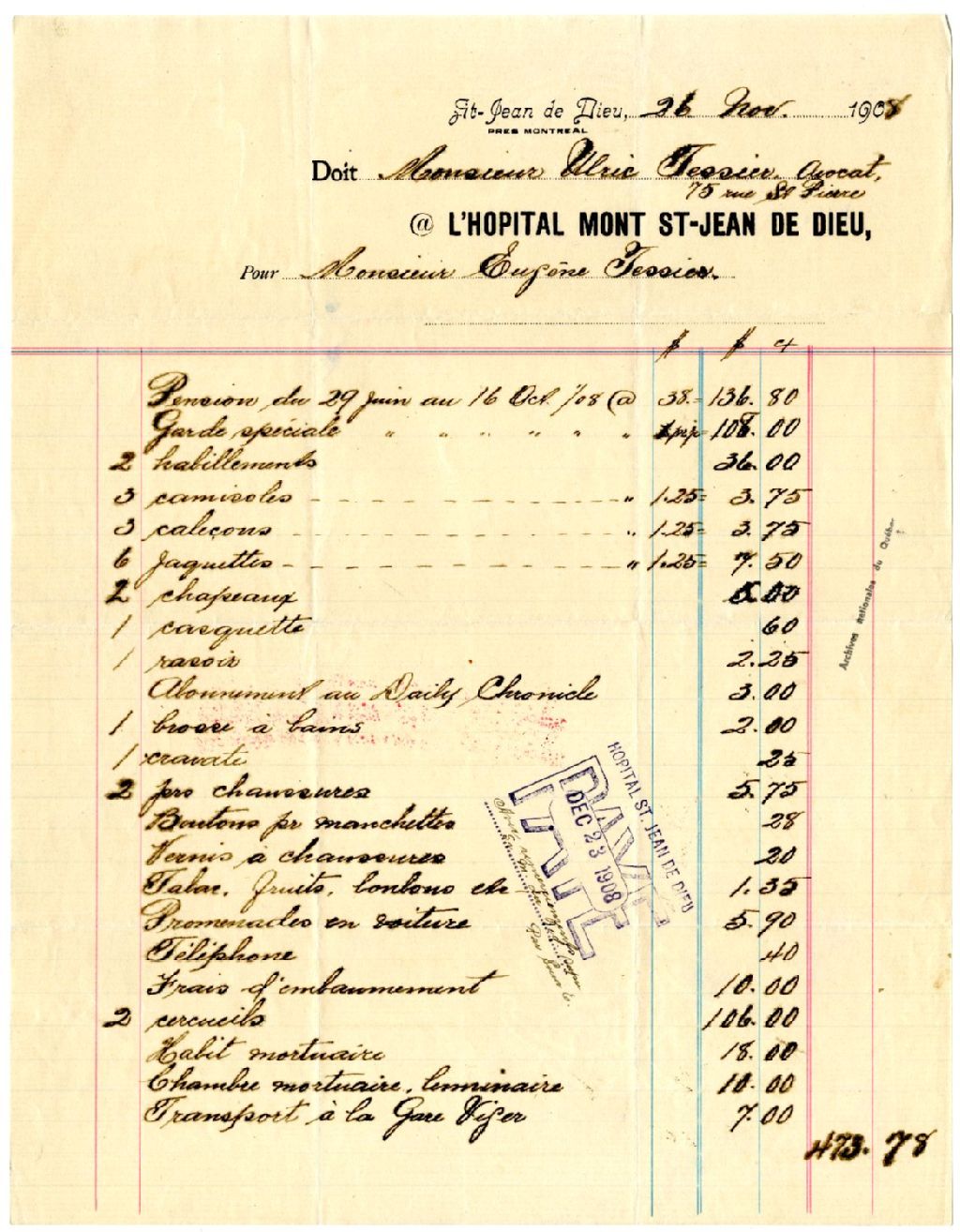 Facture de l'Hôpital Saint-Jean-de-Dieu adressée à Ulric Tessier pour les soins apportés à Eugène Tessier