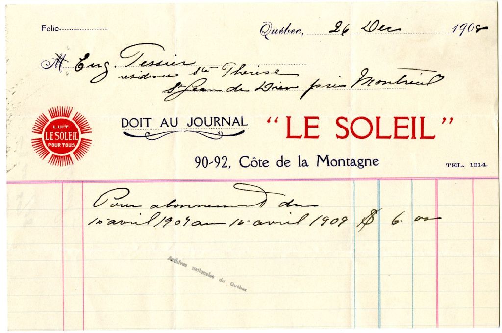 Facture du journal Le Soleil adressée à Eugène Tessier, 26 décembre 1908, Archives nationales à Rimouski, Fonds Famille Tessier, (01R,P1,S3,SS2,P297).