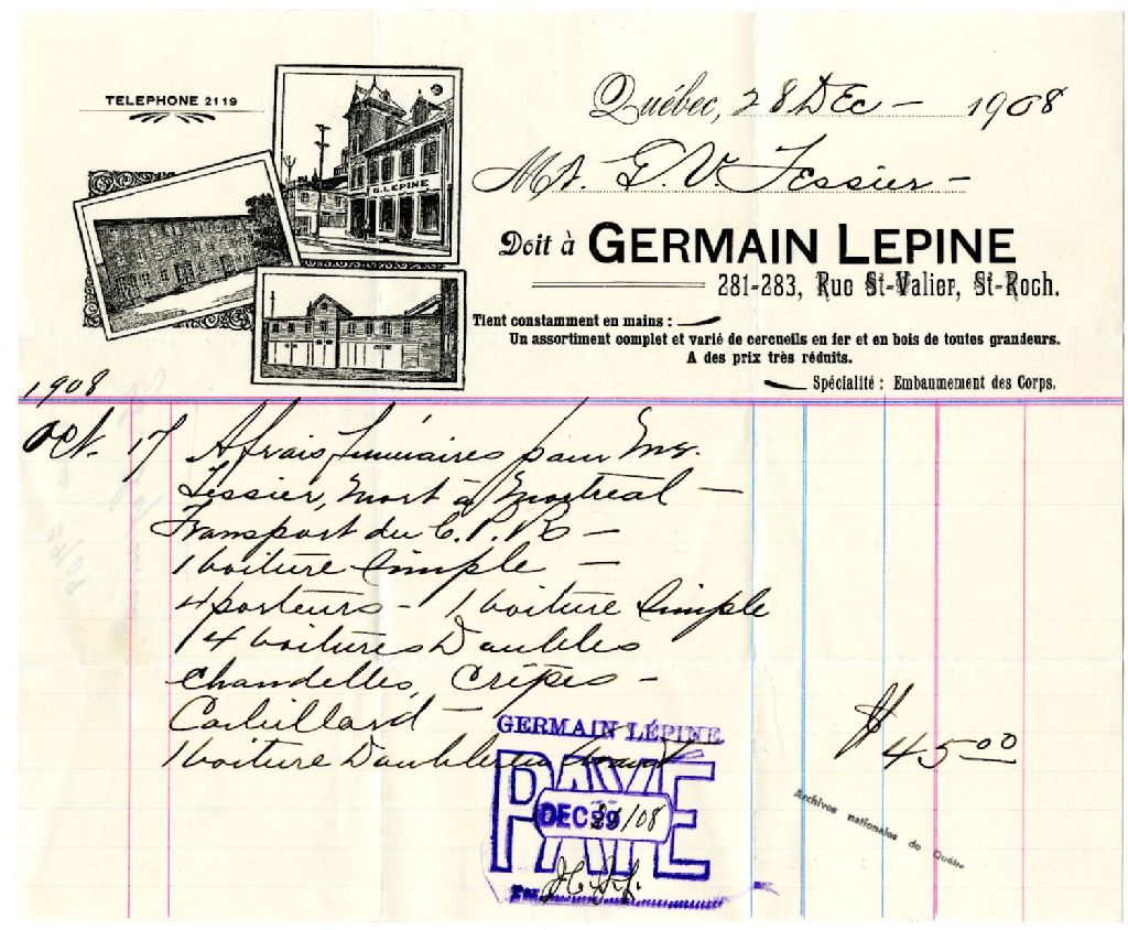 Facture de Germain Lépine pour les frais funéraires d'Eugène Tessier, 28 décembre 1908, Archives nationales à Rimouski, Fonds Famille Tessier, (01R,P1,S3,SS2,P298).
