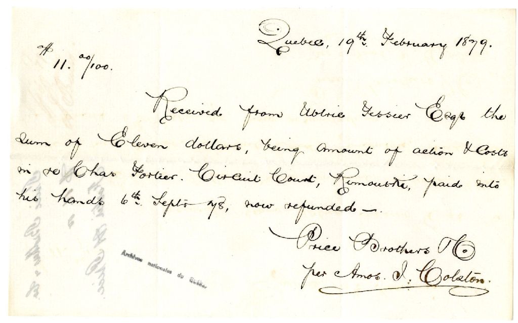 Reçu au nom d'Ulric Tessier par la Price Brothers & Company, 19 février 1879, Archives nationales à Rimouski, Fonds Famille Tessier, (01R,P1,S3,SS2,P31).