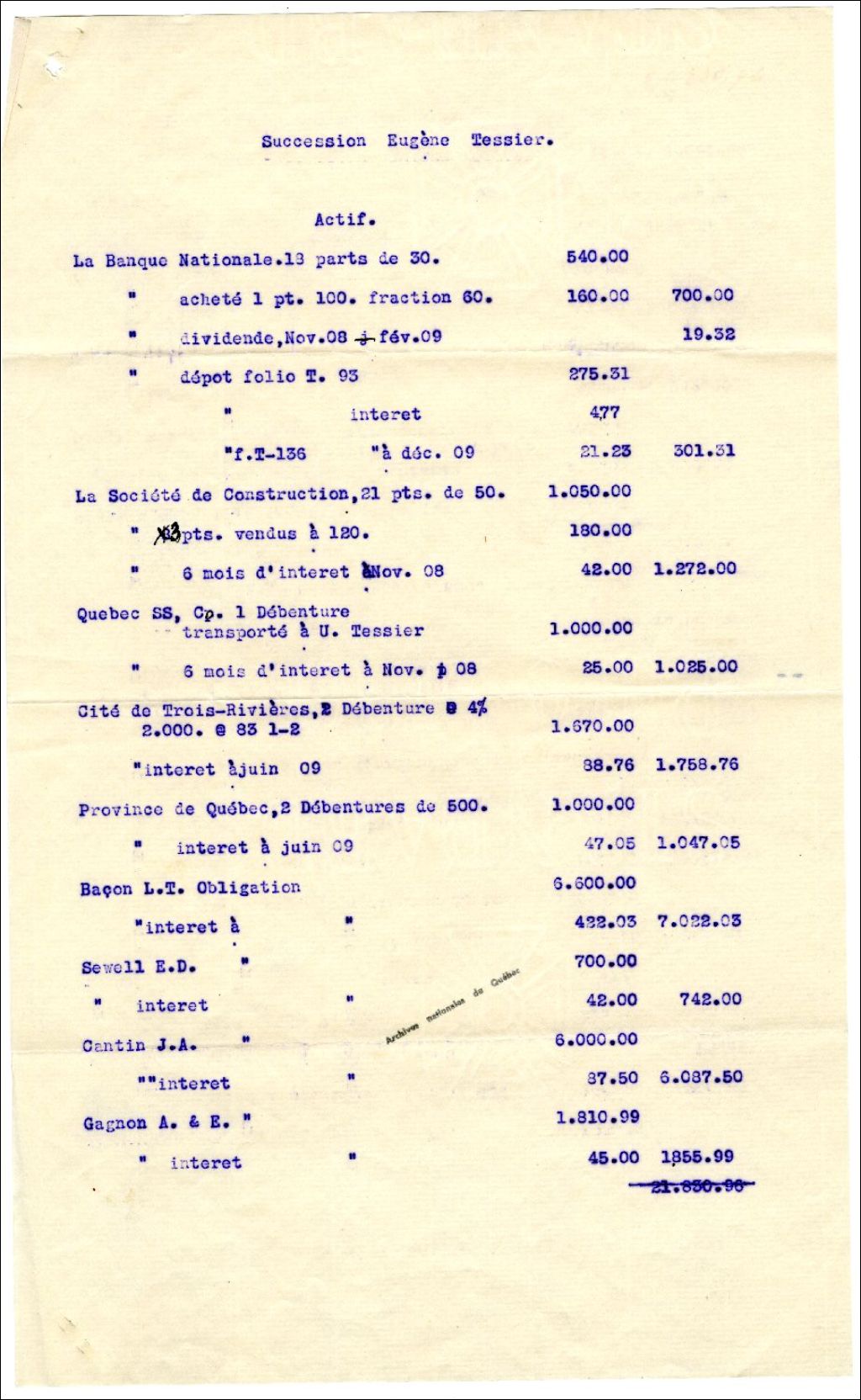 - Reddition de compte de la succession d'Eugène Tessier par Ulric Tessier