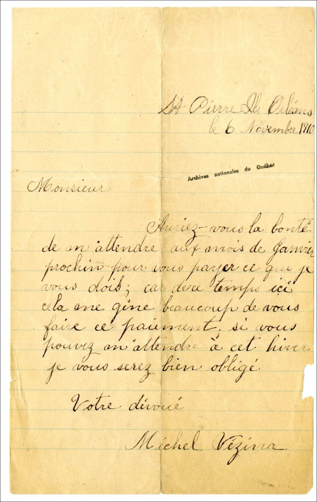 Lettre de Michel Vézina concernant le paiement [des rentes seigneuriales]