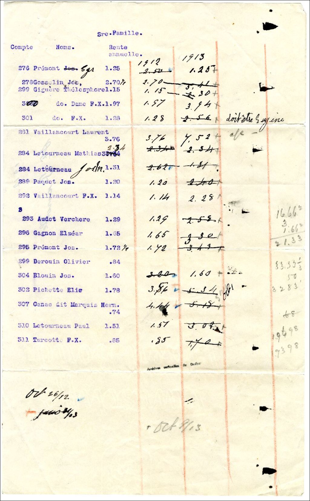 Rentes seigneuriales de Sainte-Famille, Île d'Orléans, [entre 1912 et 1913], Archives nationales à Rimouski, Fonds Famille Tessier, (01R,P1,S3,SS2,P334).