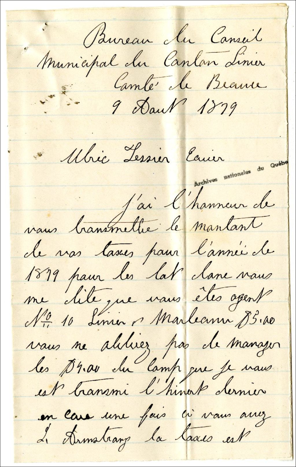 Lettre de Zéphirin Loignon, secrétaire trésorier du Conseil municipal du canton de Linière à Ulric Tessier concernant les taxes, 9 août 1879, Archives nationales à Rimouski, Fonds Famille Tessier, (01R,P1,S3,SS2,P34).