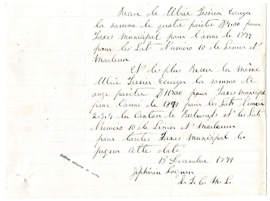 Reçu au nom d'Ulric Tessier pour le paiement des taxes à Zéphirin Loignon, secrétaire trésorier du Conseil municipal du canton de Linière, 15 décembre 1879, Archives nationales à Rimouski, Fonds Famille Tessier, (01R,P1,S3,SS2,P37).