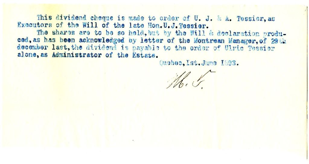 Note à la succession d'Ulric-Joseph Tessier concernant ses dividendes à la Canadian Bank of Commerce, 1 juin 1893, Archives nationales à Rimouski, Fonds Famille Tessier, (01R,P1,S3,SS2,P68).